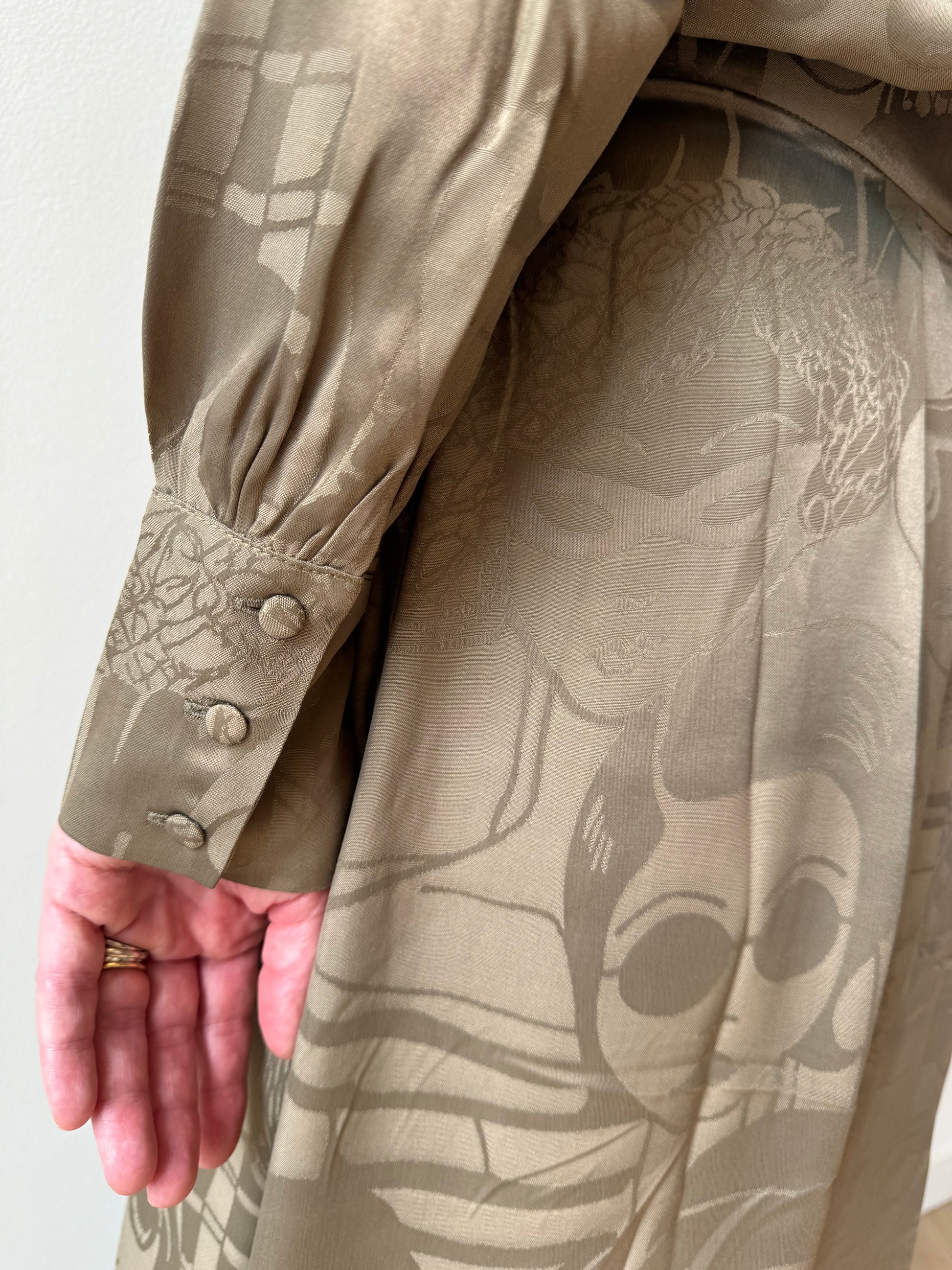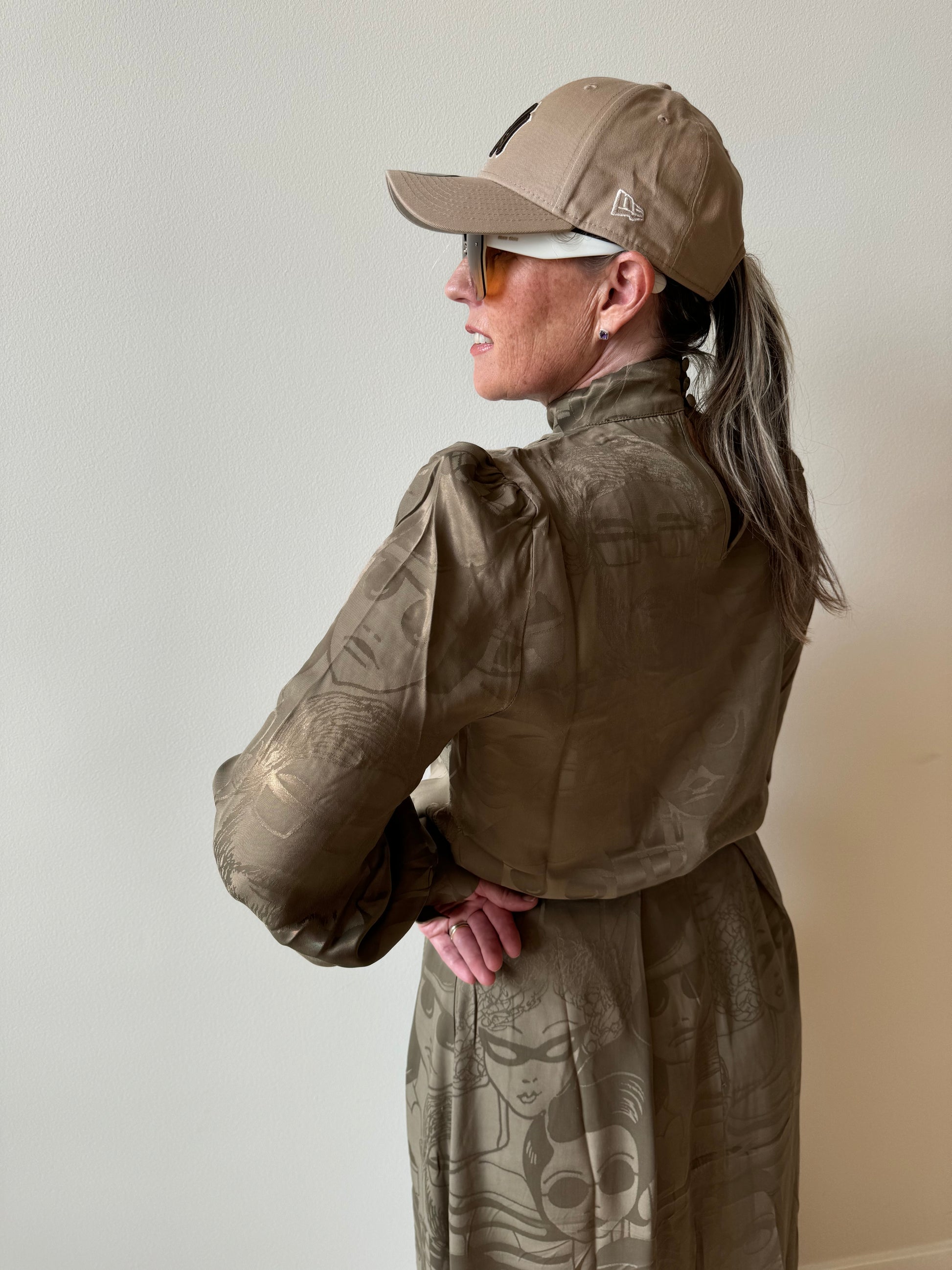 Bowie blouse in olive with printed faces that features a turtleneck and elegant cuffs with three buttons, beautifully finished for a timeless and chic look. Pairs perfectly with the matching ‘Elle’ skirt for a refined, coordinated look. Love the full set? Be sure to check out the co-ord option as a separate item. This piece is sold individually.
