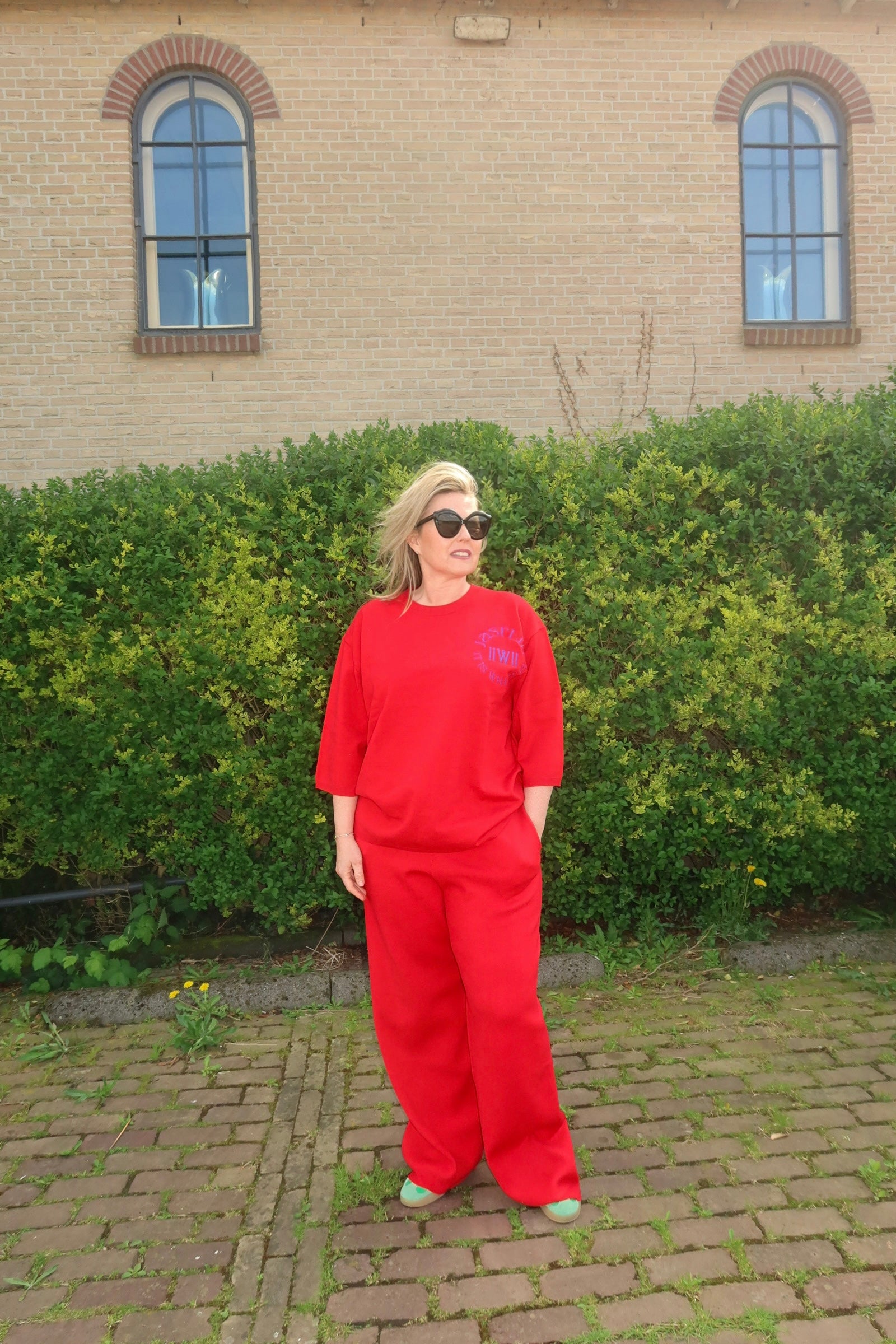 The Gigi half-sleeve top in lipstick red with purple logo features an effortless oversized fit — made for comfort with a cool edge.
