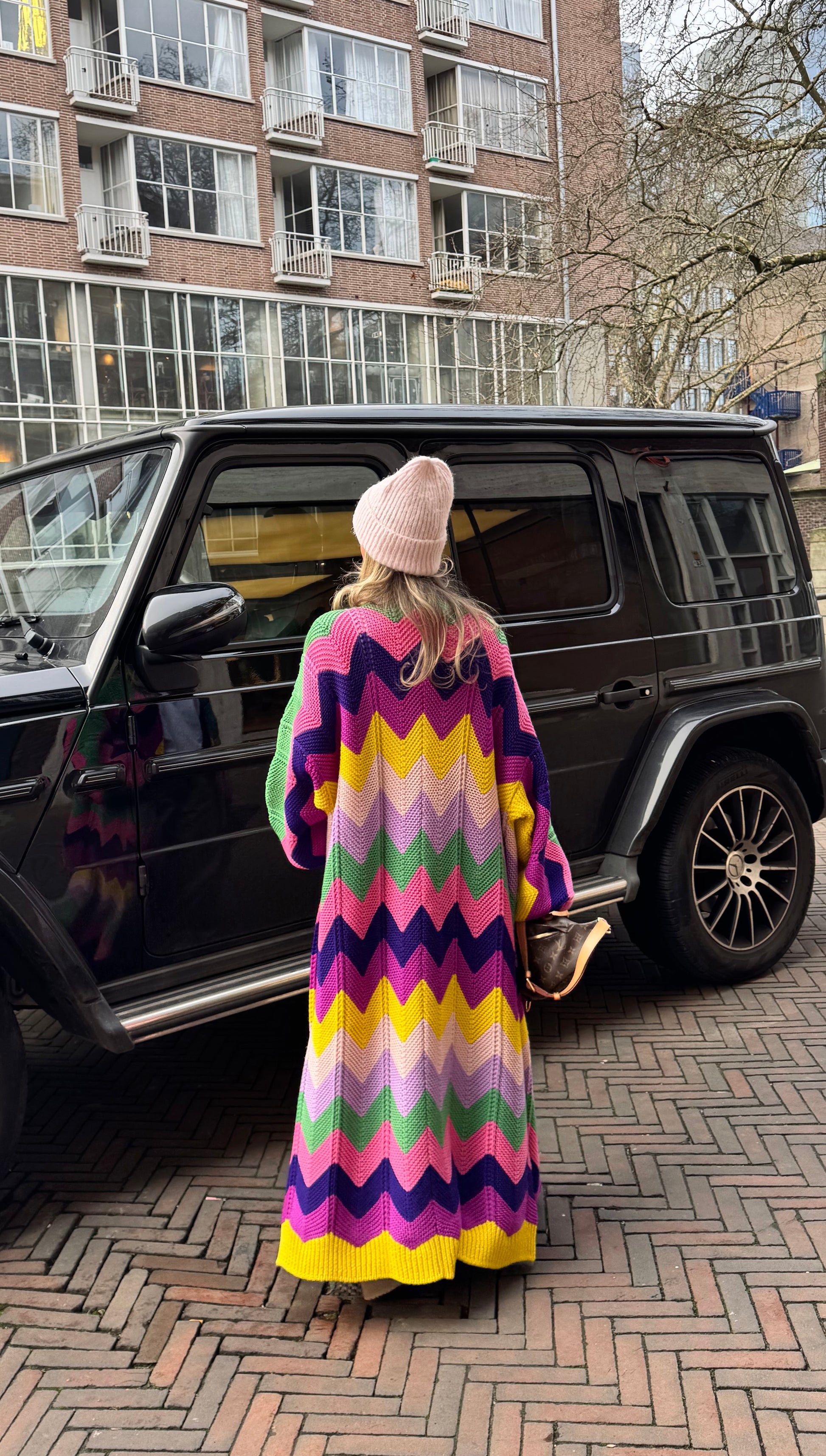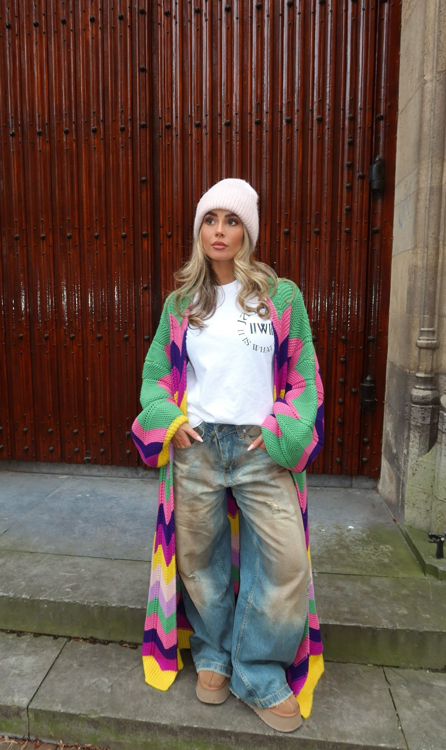 The Harper cardigan is crafted from luxurious wool and features a bold zigzag pattern in vibrant rainbow tones. Versatile and eye-catching, it pairs effortlessly with our co-ord sets or adds a playful pop to a simple tee and jeans. A true statement piece that elevates any look.